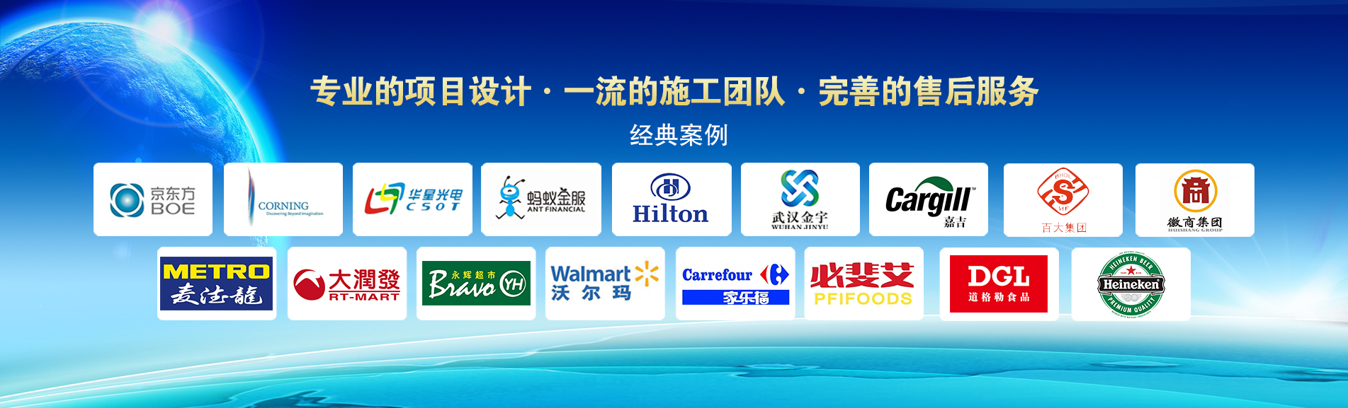 冷凍冷藏設(shè)備大型冷庫項目: 武漢中百物流冷庫(40000㎡)、蘇州、北京普洛斯大型物流庫(17000㎡)、沈陽佳德物流冷庫(20000㎡)、上海東航配餐物流庫(6000㎡)、杭州華商勾莊物流冷庫(24000㎡)、安徽安心蔬菜綠色食品冷庫(12000㎡)、武漢金宇冷庫(35000㎡)、必斐艾食品廠(14000㎡)、中國-東盟(百色)農(nóng)產(chǎn)品交易中心冷庫物流工程(30000㎡)、遵鐵物流冷鏈物流區(qū)建設(shè)項目中心冷庫物流工程(16500㎡)、長沙云冷產(chǎn)業(yè)園冷庫物流工程(21000㎡)等;大型中央空調(diào)項目: 武漢康寧顯示玻璃廠廠房、武漢京東方模組廠房、武漢華星光電模組廠房、深圳華星光電模組廠房,杭州阿里巴巴辦公樓,舟山波音737機場辦公樓,南京江北能源站、上海金融大酒店等